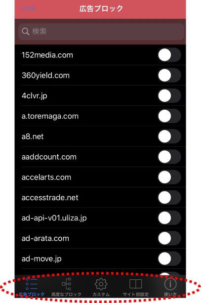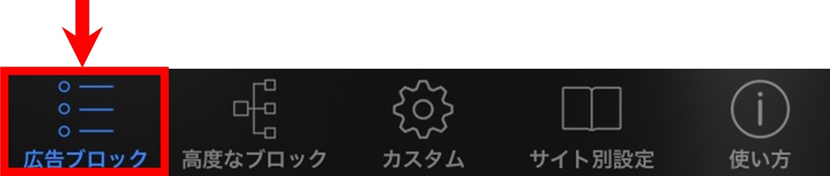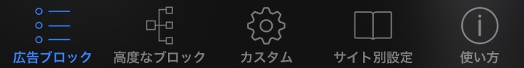 Adfilterアプリ画面下にメニュー部分があります。各メニューをクリックすることで、コンテンツ別の画面に切り替え、それぞれの画面でブロック(非表示)にしたいコンテンツを設定することができます。