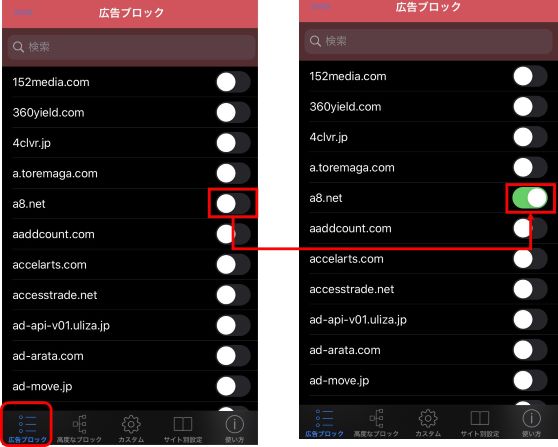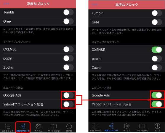 広告ブロックをクリックすると以下の画面で、ブロックしたい広告の部分を「OFF(無効)」から「ON(有効)」に切り替えるだけ。