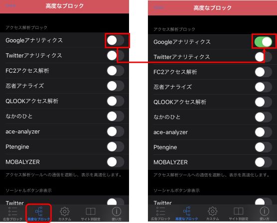 GoogleアナリティクスやFC2アクセス解析などの解析ツールをブロック(非表示)することができます。ブロック(非表示)したいコンテンツを「OFF(無効)」→「ON(有効)」に切り替えるだけ。