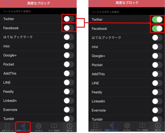 ブロック(非表示)したいSNSを「OFF(無効)」→「ON(有効)」に切り替えるだけ。