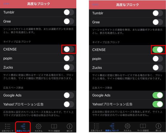 ブロック(非表示)したいネイティブ広告を「OFF」→「ON」に切り替えるだけ。