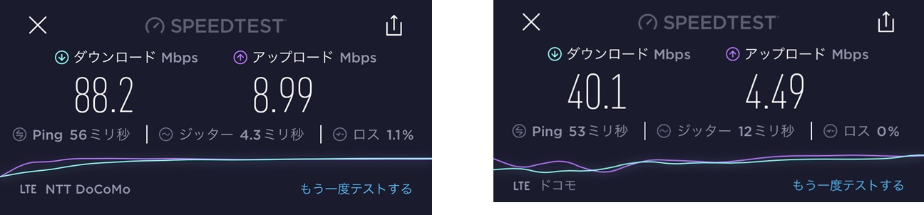 【左】IIJmio esim通信(iPhone SE) 【右】友人のiPhone(ドコモキャリア 通信)
