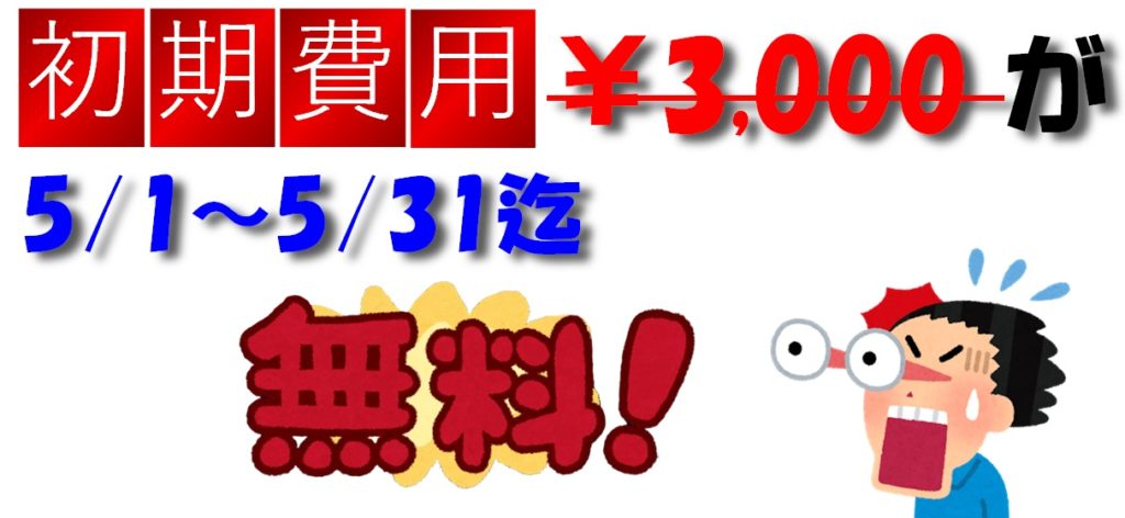 通常なら、新規加入時に¥3,000円の初期費用がかかるところ、5月1日~5月31日迄の期間限定キャンペーンで今なら¥0円で加入することができます。
