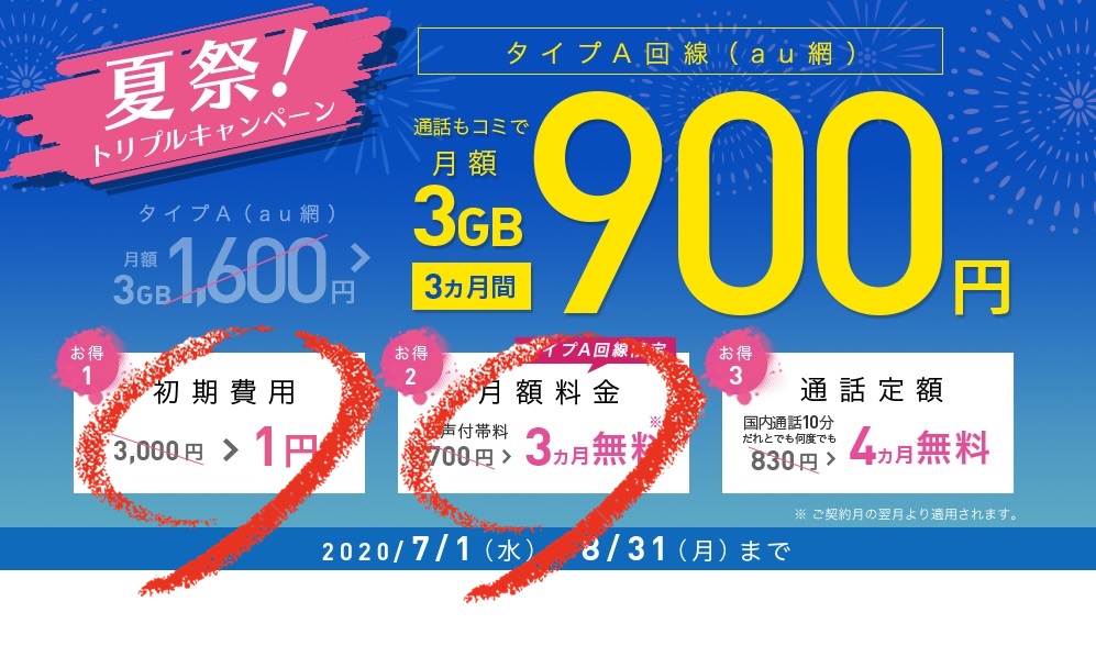 音声通話が¥0円、初期費用が¥1円、SIMカード発行手数料の金額などについて詳しく知りたい方は、2020/07/01~2020/08/31の期間に限定「夏祭!トリプルキャンペーン」について以下の記事で分かりやすく説明していますので是非参考にしてみて下さい♪