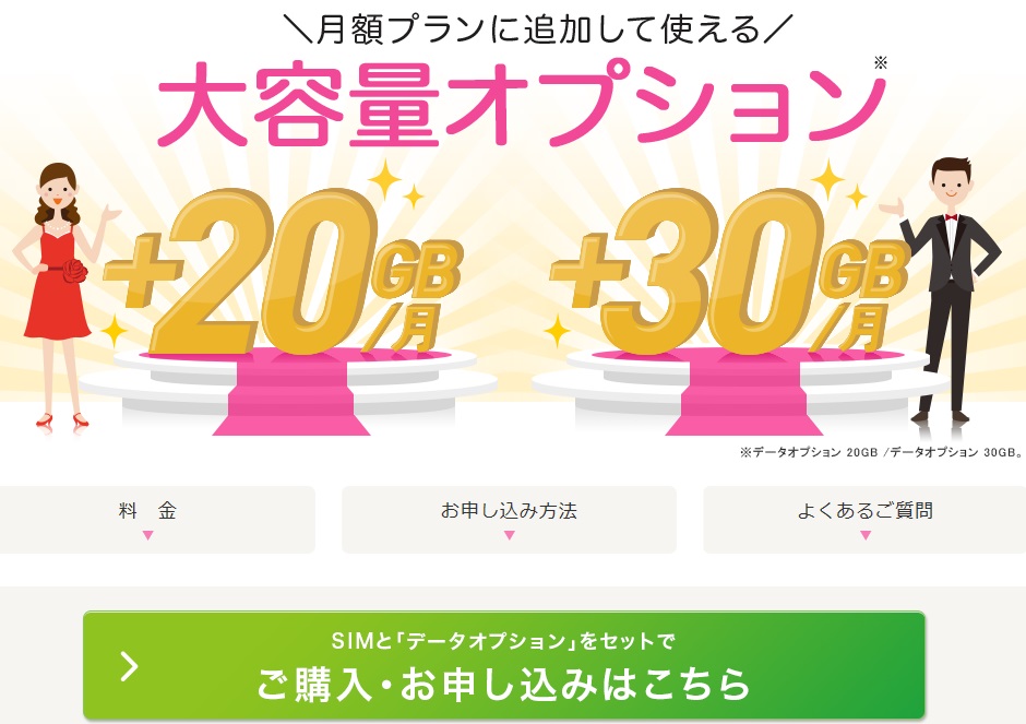 30GBのデータ通信サービスを『無料』で利用できるクーポンを受け取るためには、20GB以上の大容量オプションで申し込む必要があります。