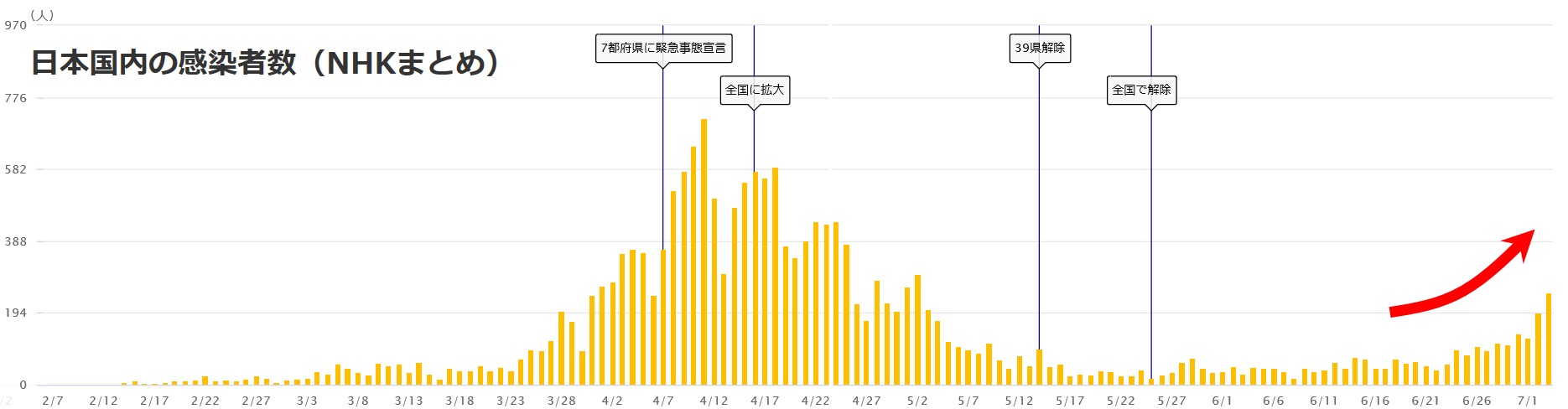 新型コロナウイルス感染拡大が収束に向かうと思われていた2020年6月でしたが、7月に入り残念ながら感染者が各県で増加しているようです。