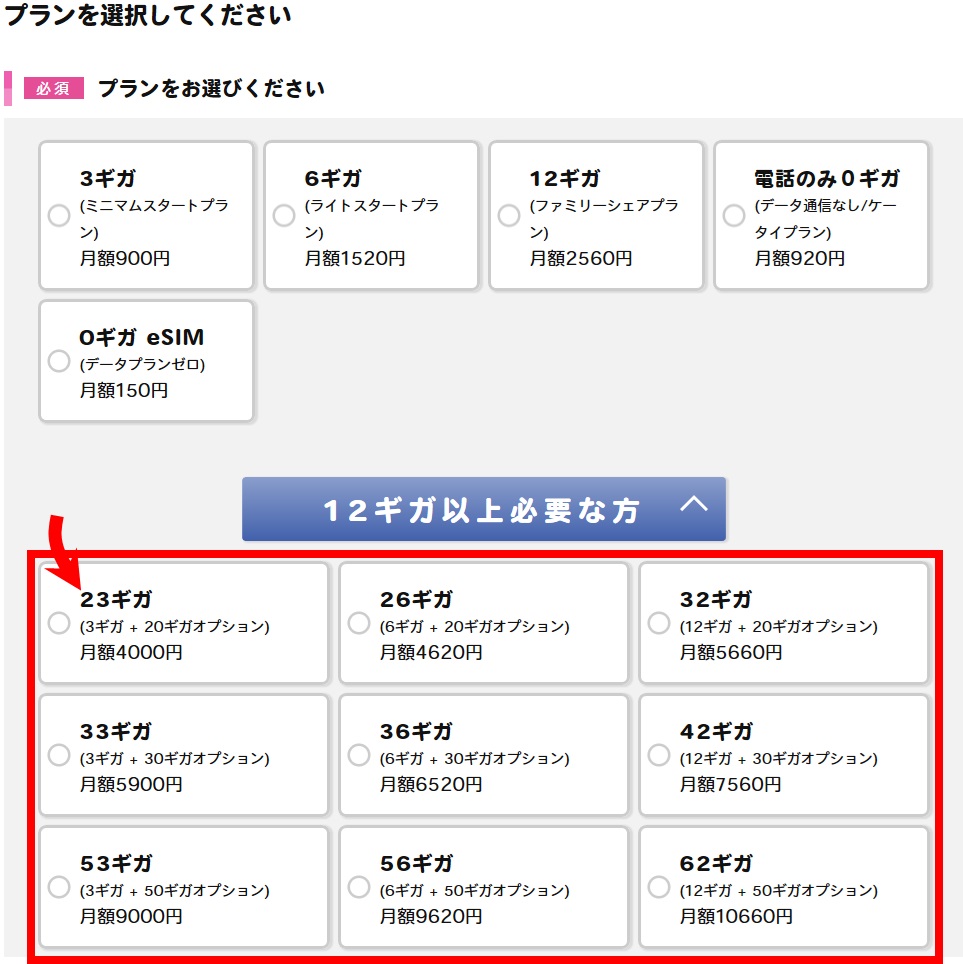 最低でも月額¥4,000円の「23ギガ」オプションプランに加入する必要があります。