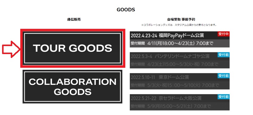 通信販売のツアーグッズは、オフィシャルサイトの「TOUR GOODS」ボタンから確認することができます。