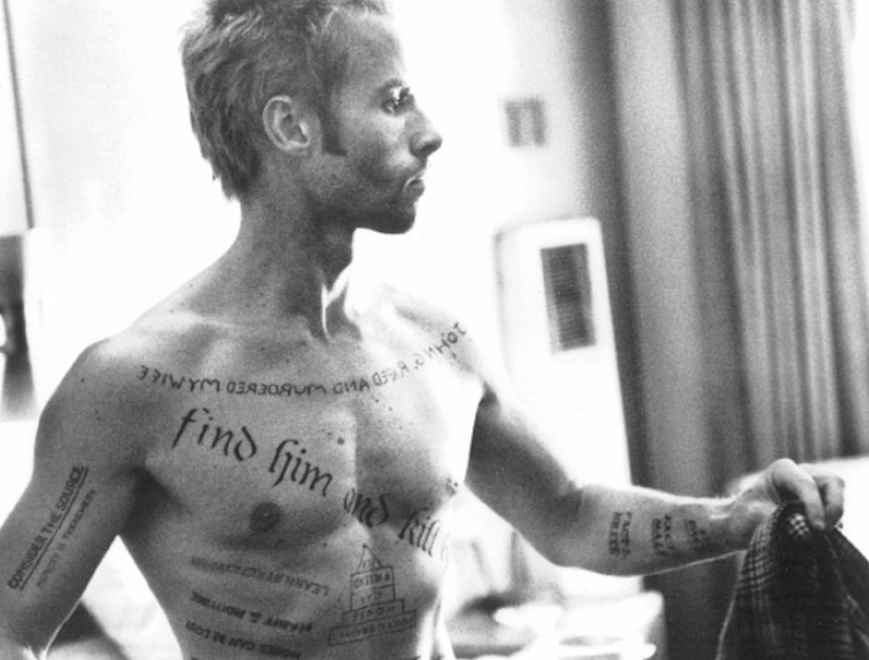 復讐のためレナードは自分の周りに起こった出来事や人々をポラノイドカメラで撮影し、写真にメモを取り、重要な情報は自身の体にタトゥーとして記録しながら犯人を追います。